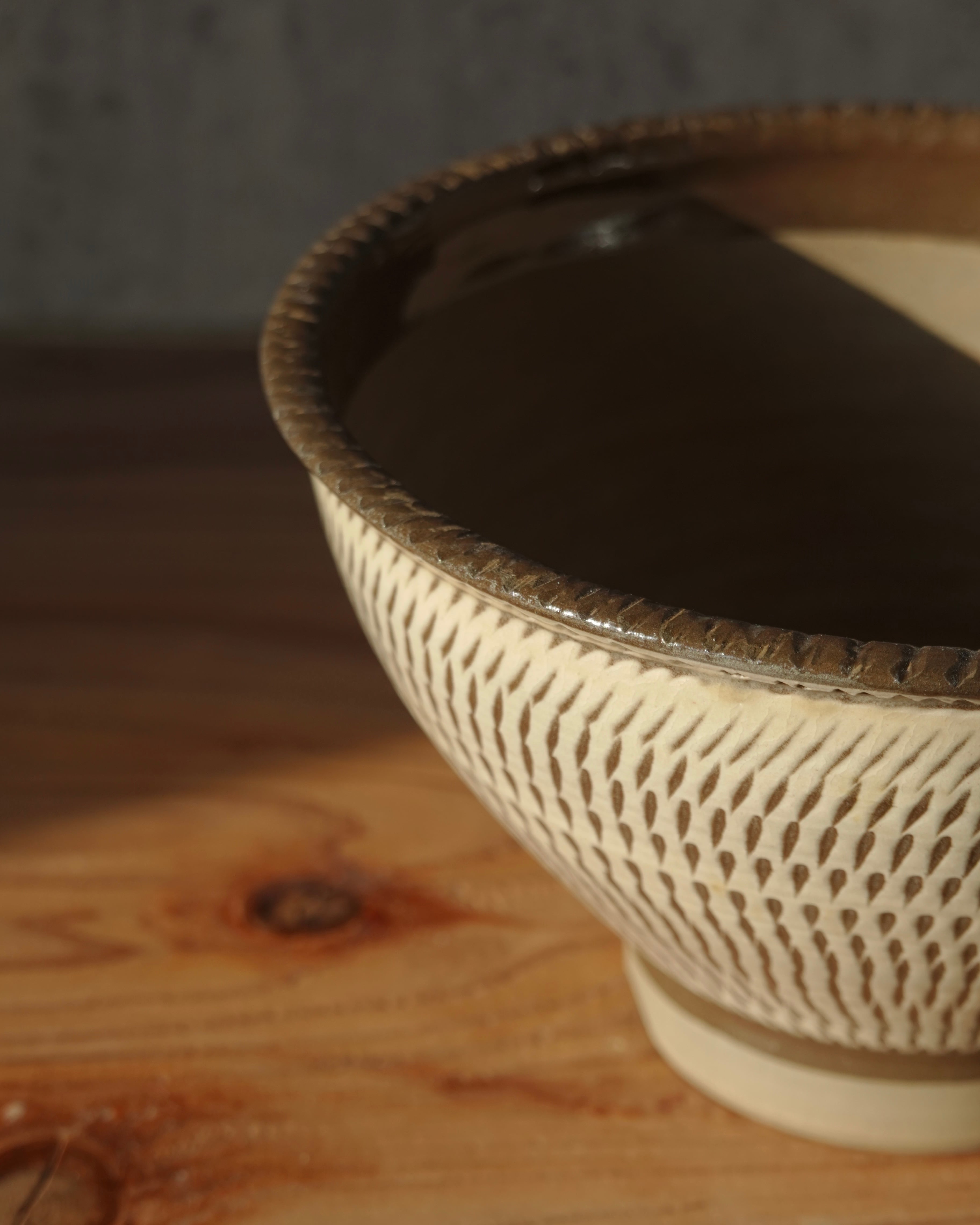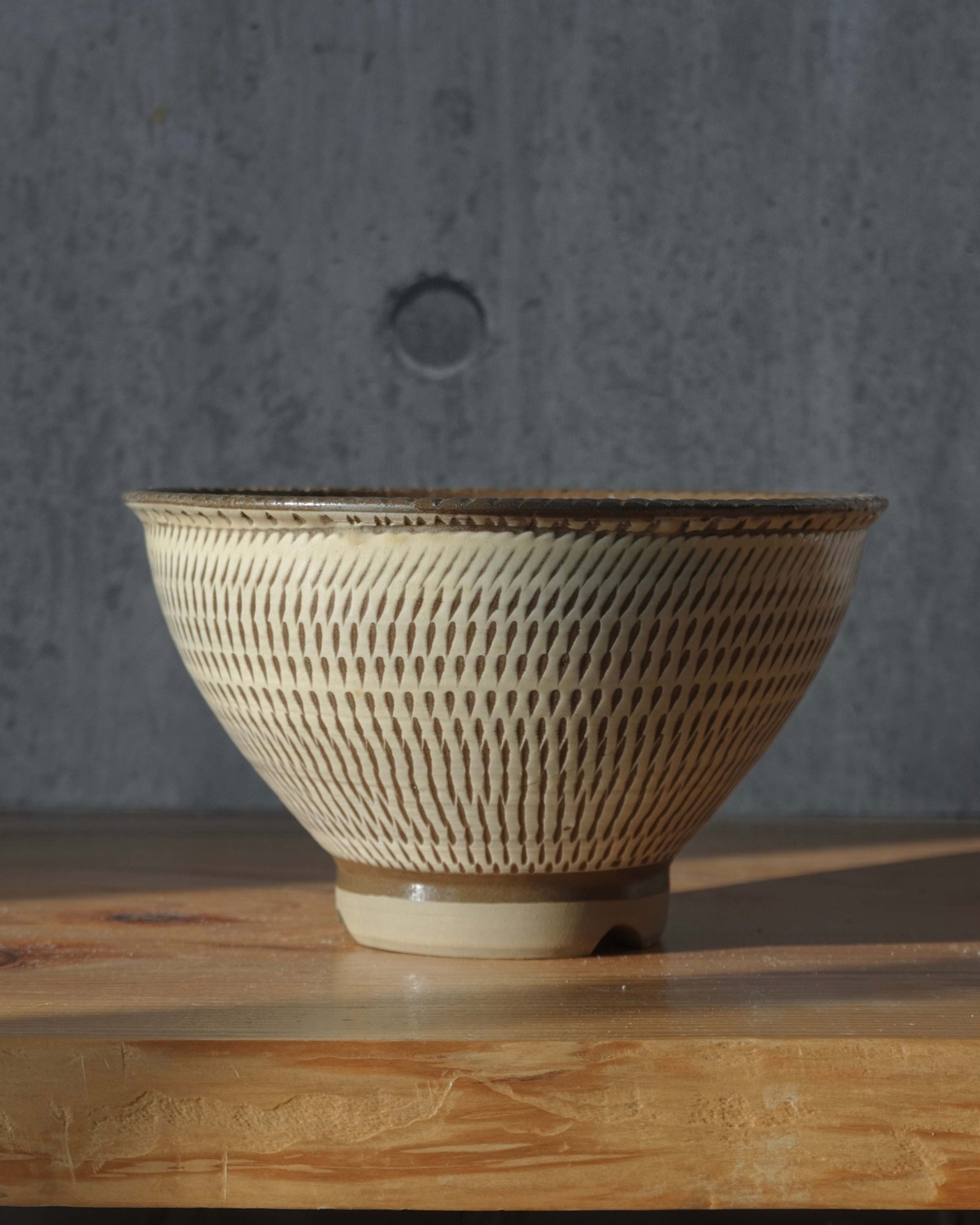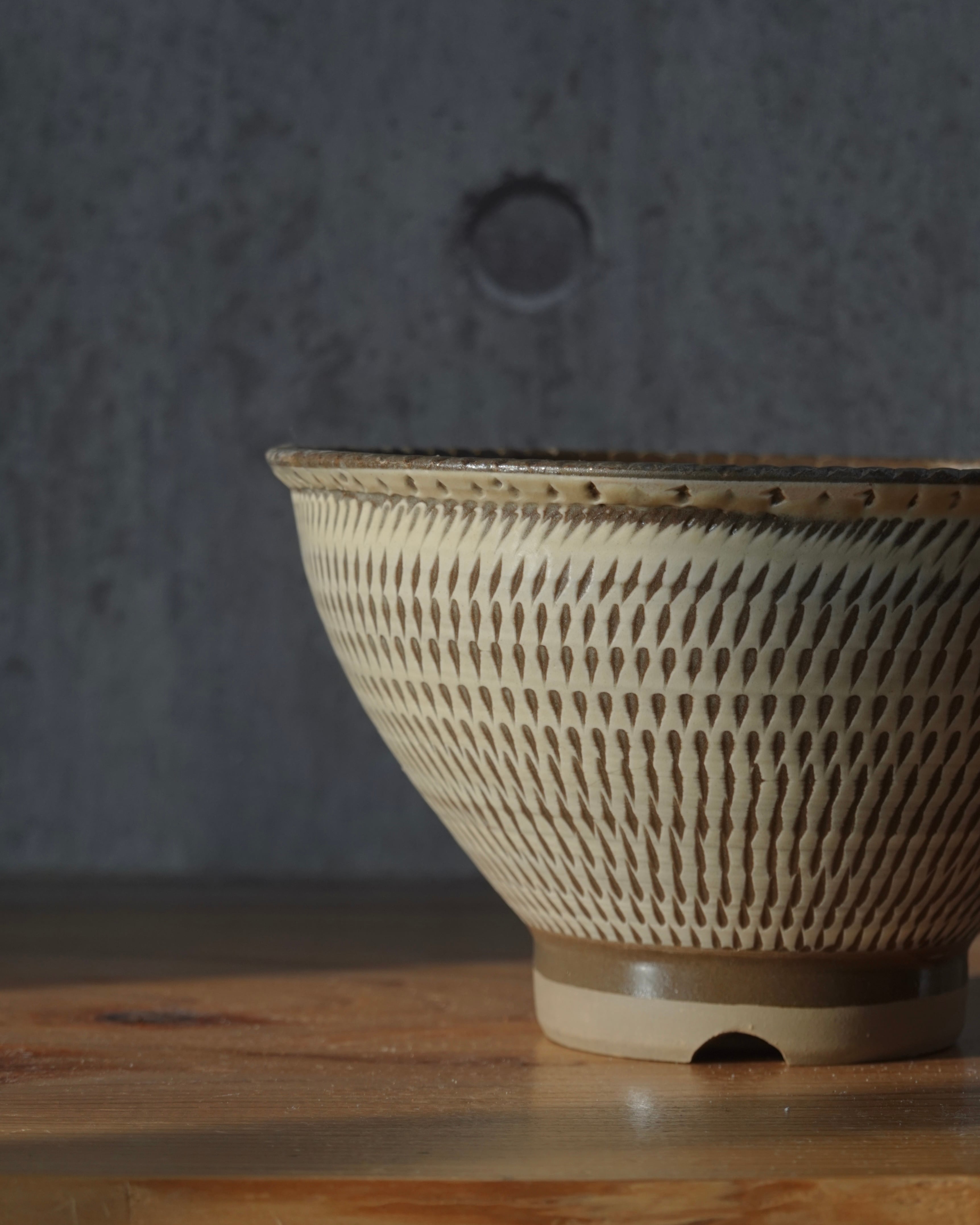 お茶碗のようなシルエットに、飛び鉋で模様があしらわれた中鉢です。