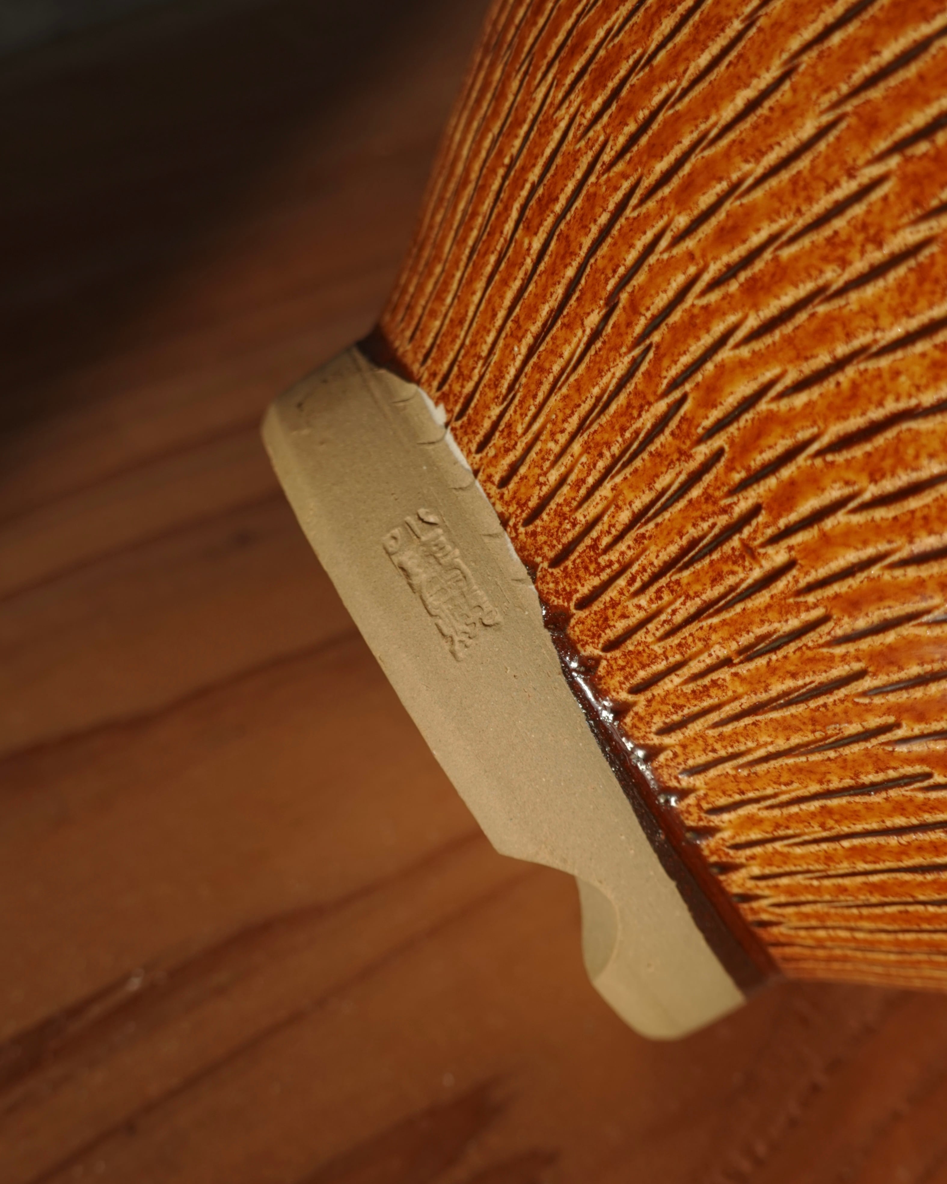 小鹿田焼らしい、赤みがかったブラウンカラー。口縁部分にも細やかに柄が施されています。
