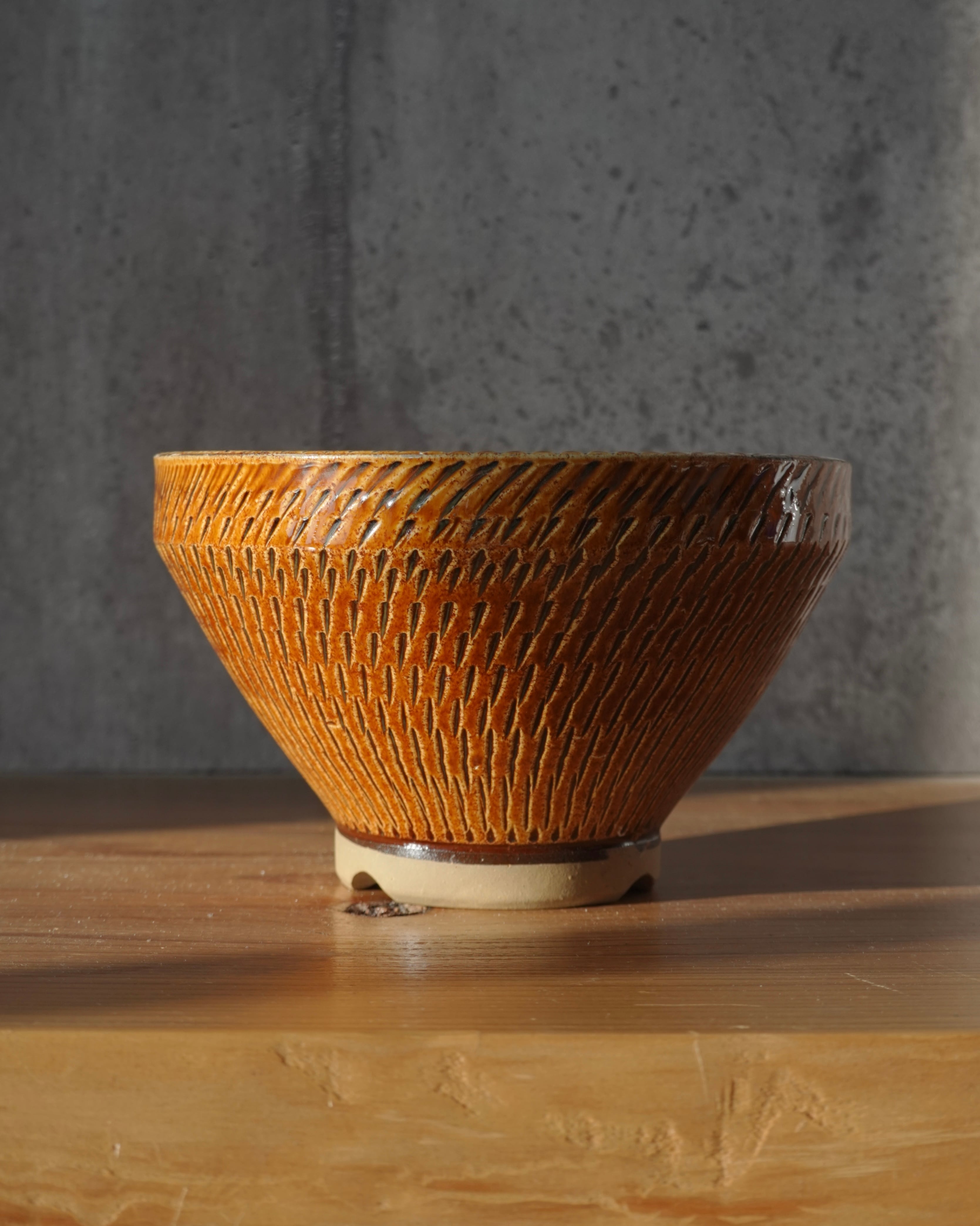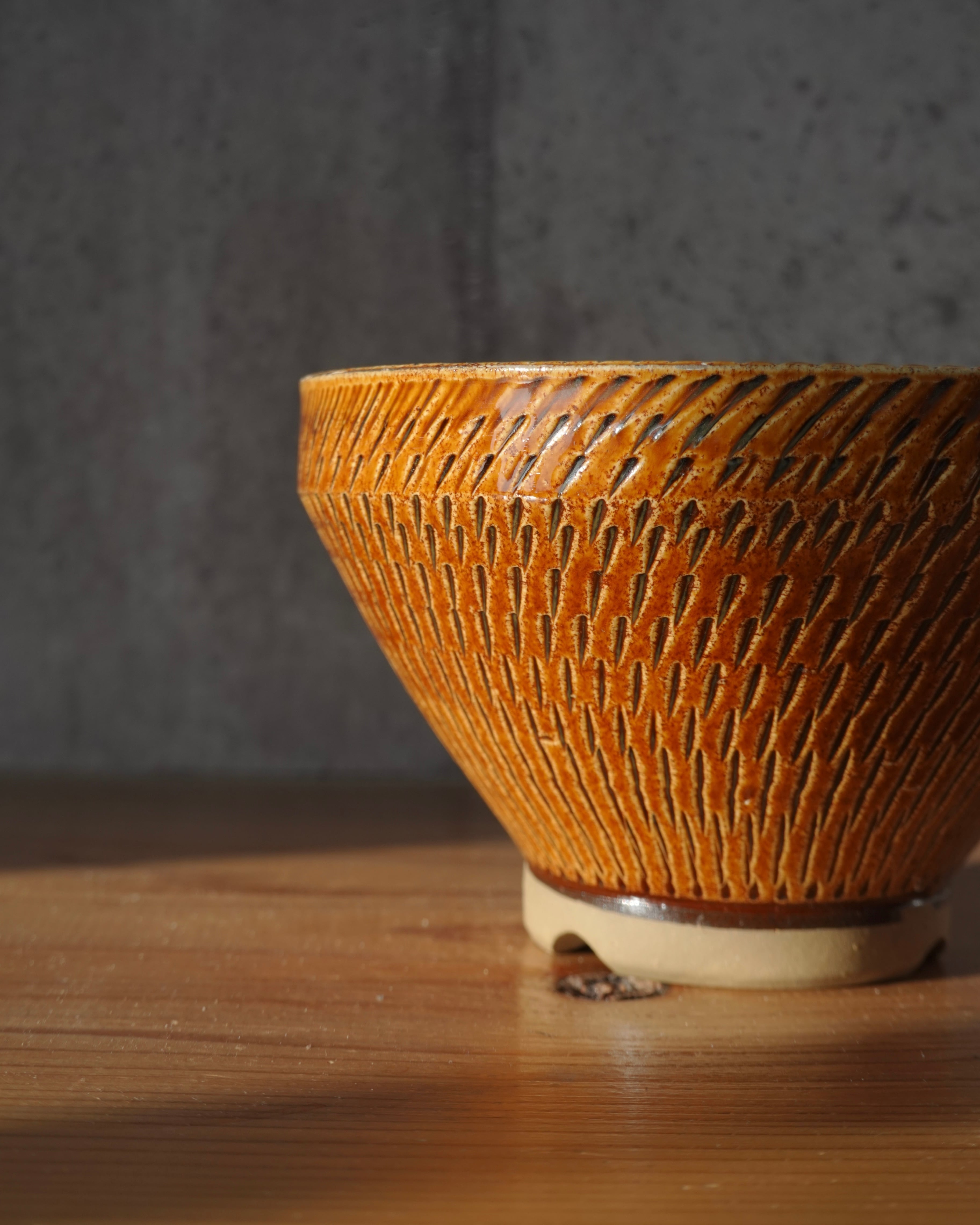 ゴマすり鉢のような富士山型の中鉢。飛び鉋で模様があしらわれています。