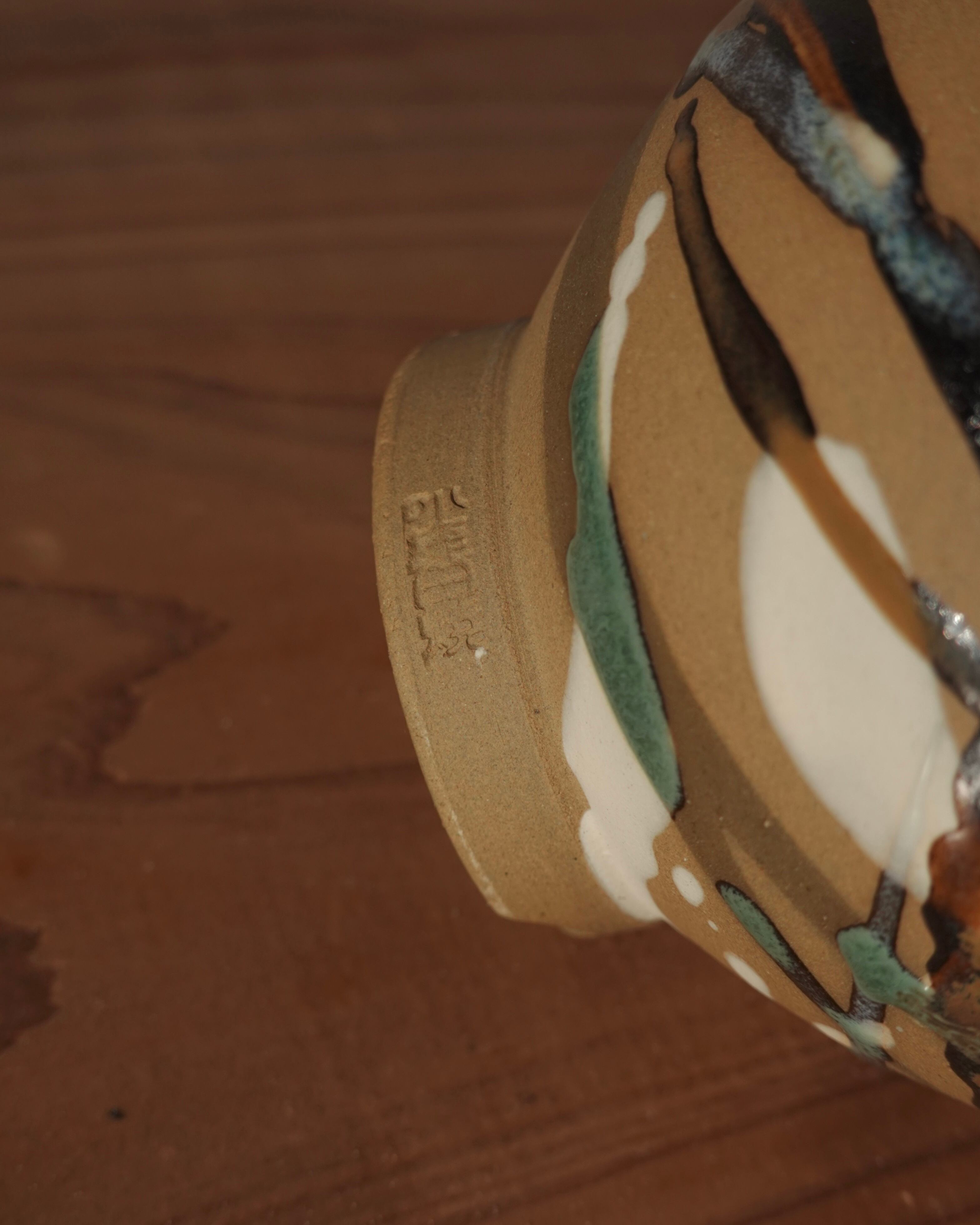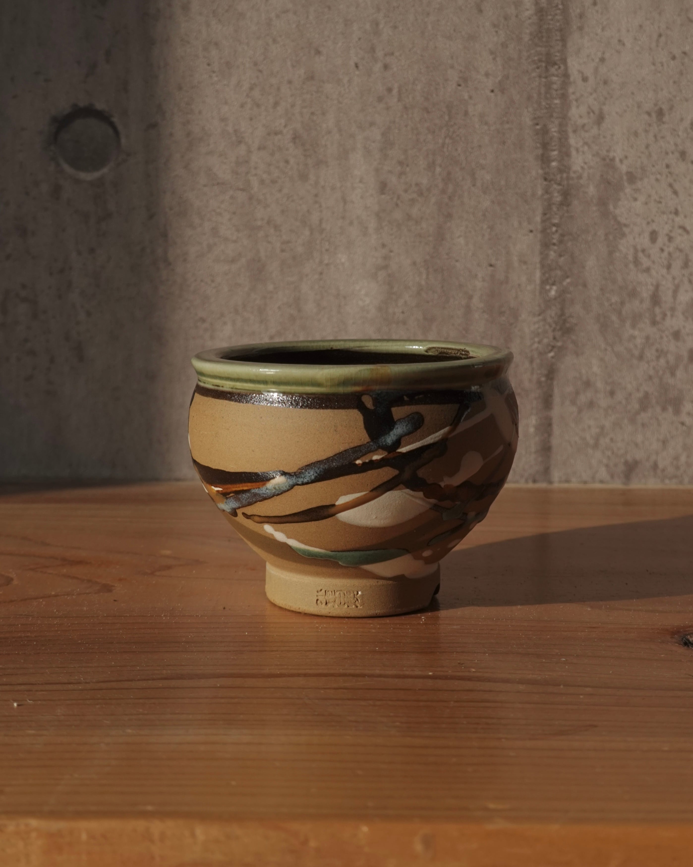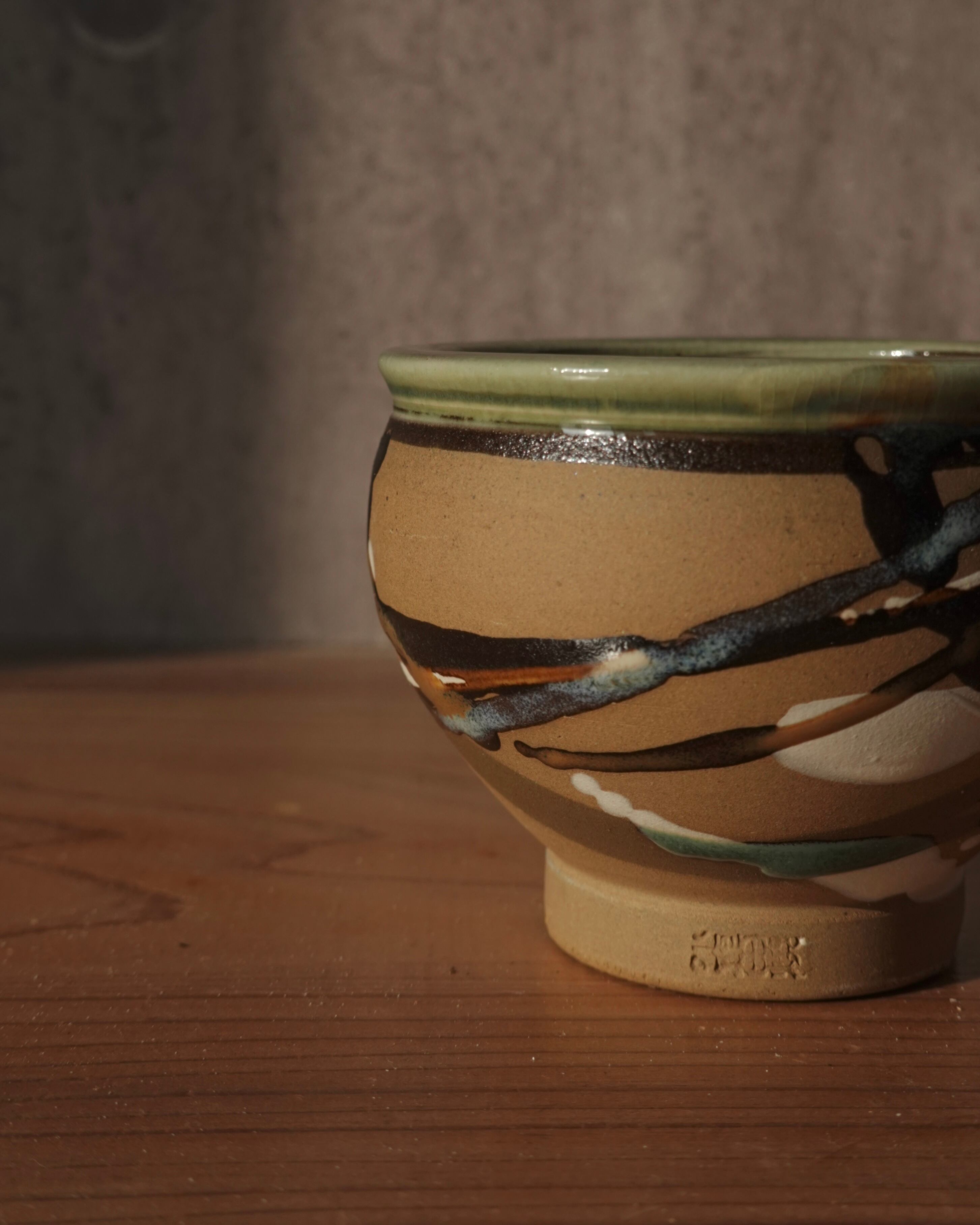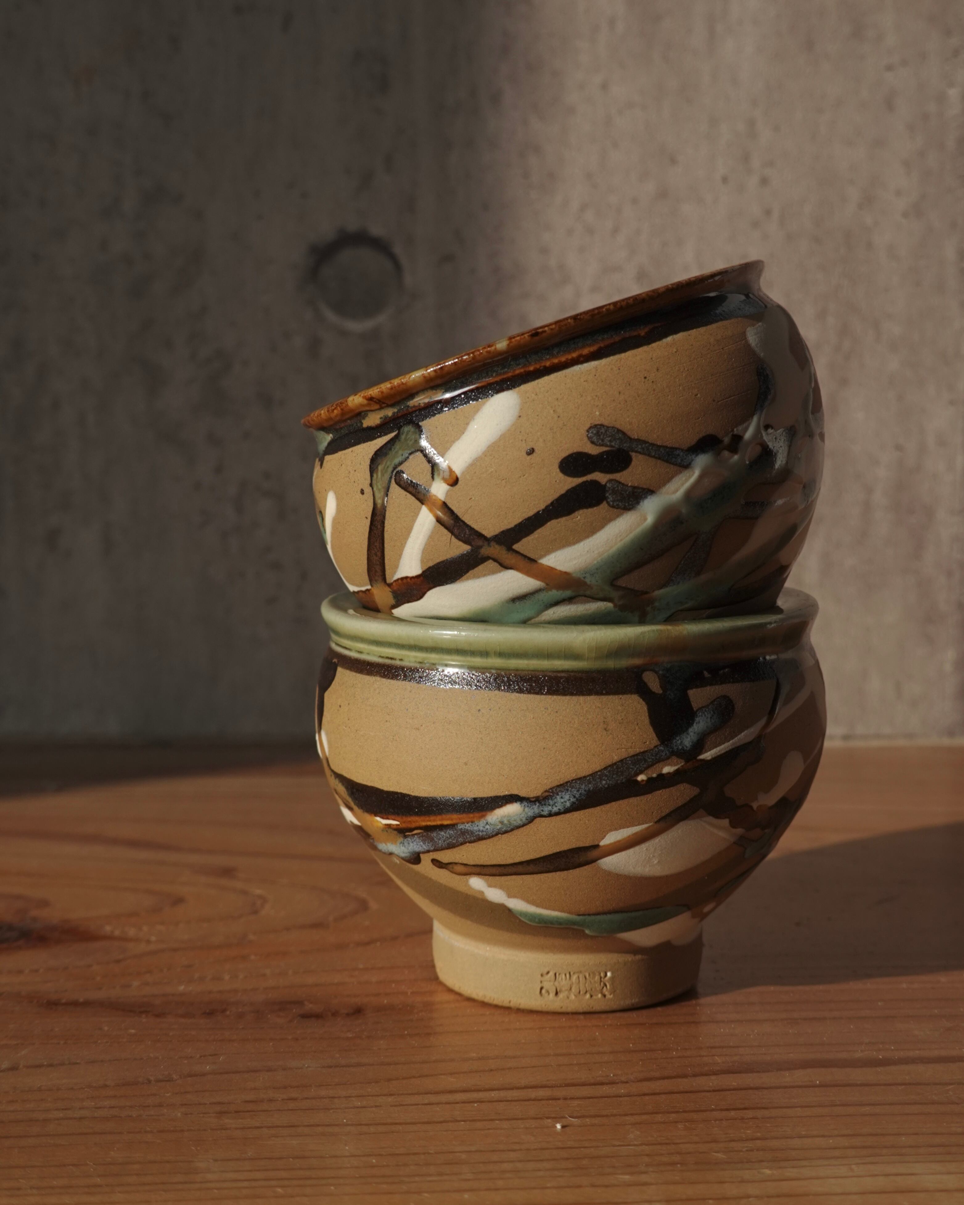 ころんとしたシルエットに、流し掛けで模様があしらわれた小鉢。