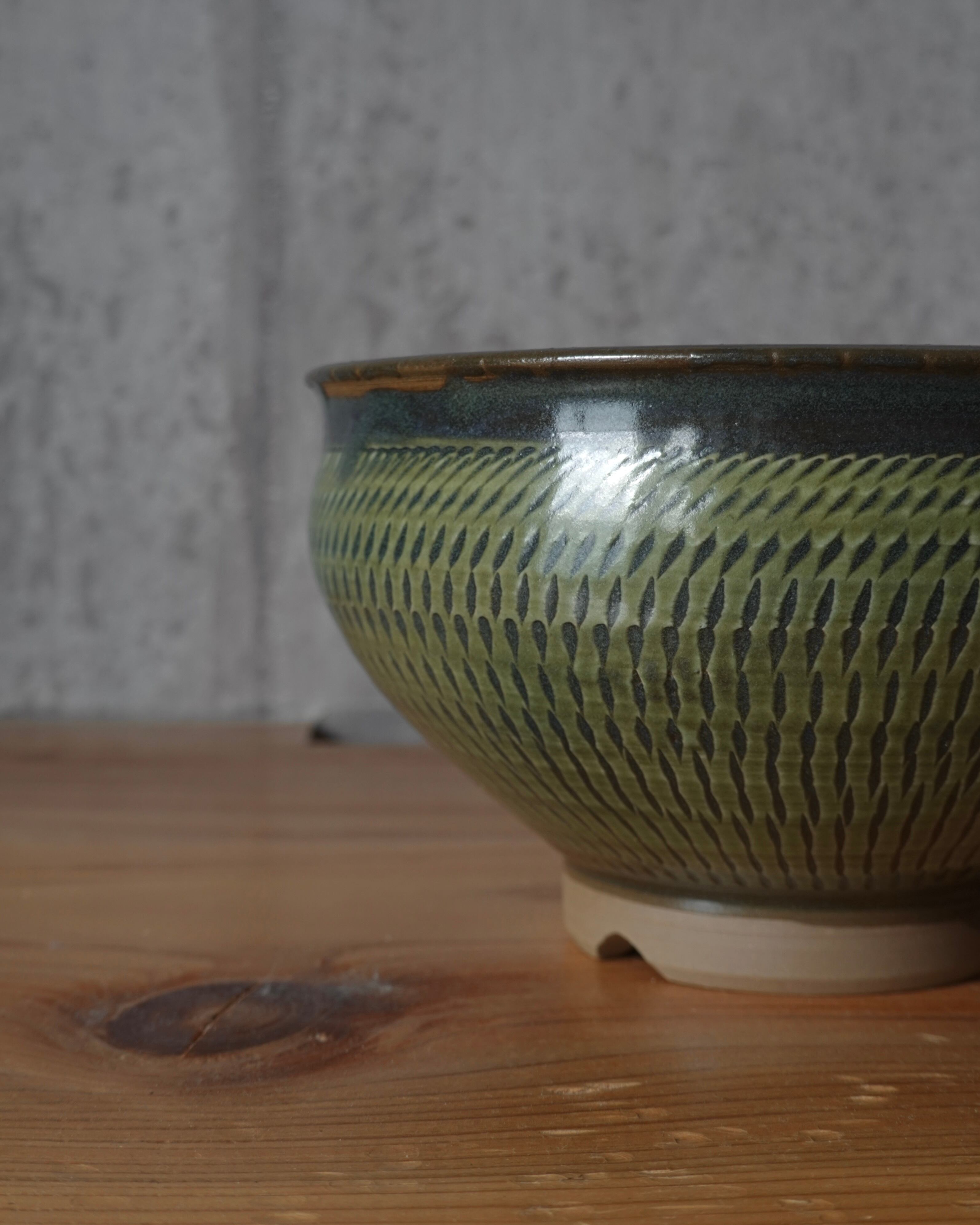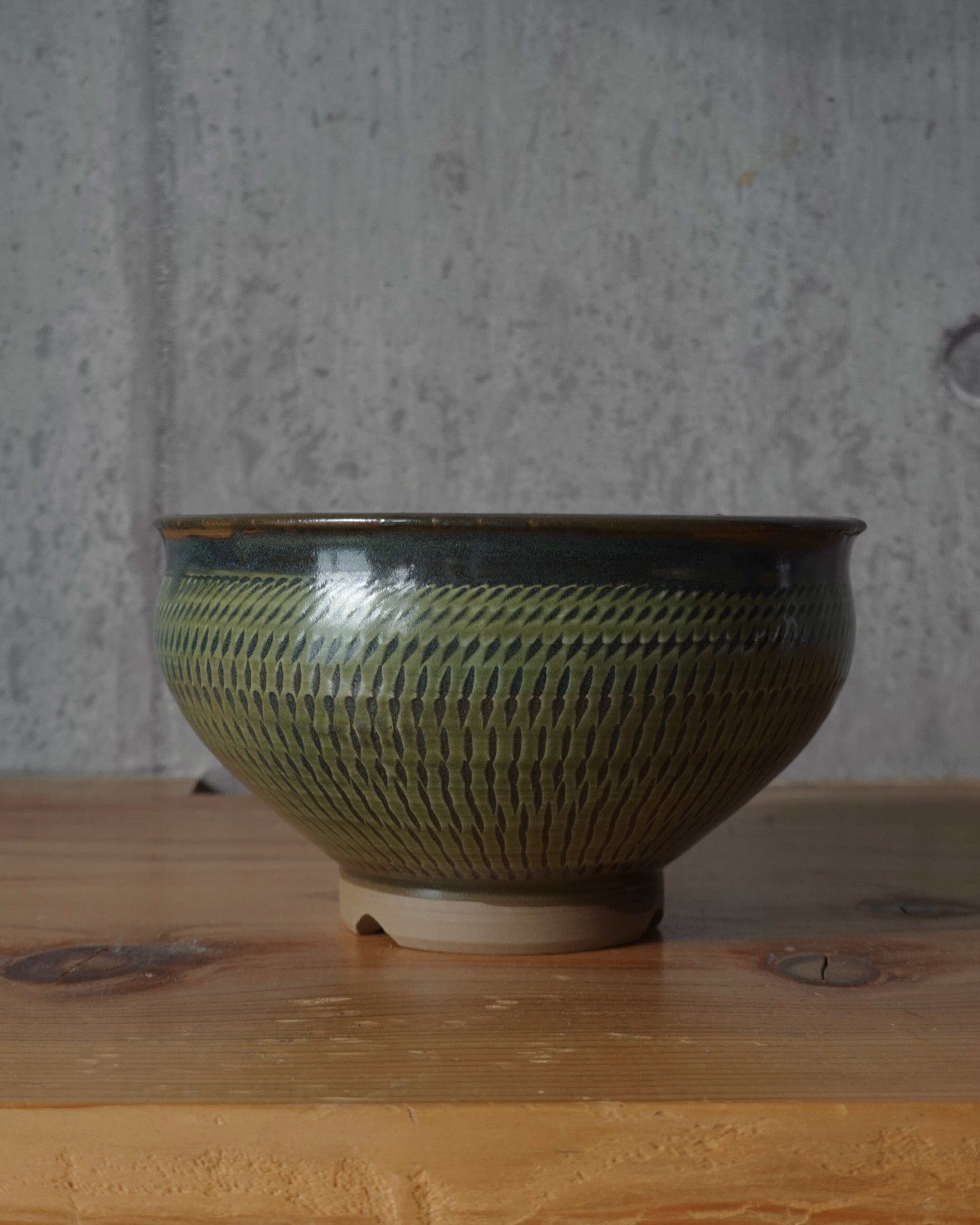 壺のようなころんとしたシルエットに、飛び鉋で模様があしらわれた中鉢。