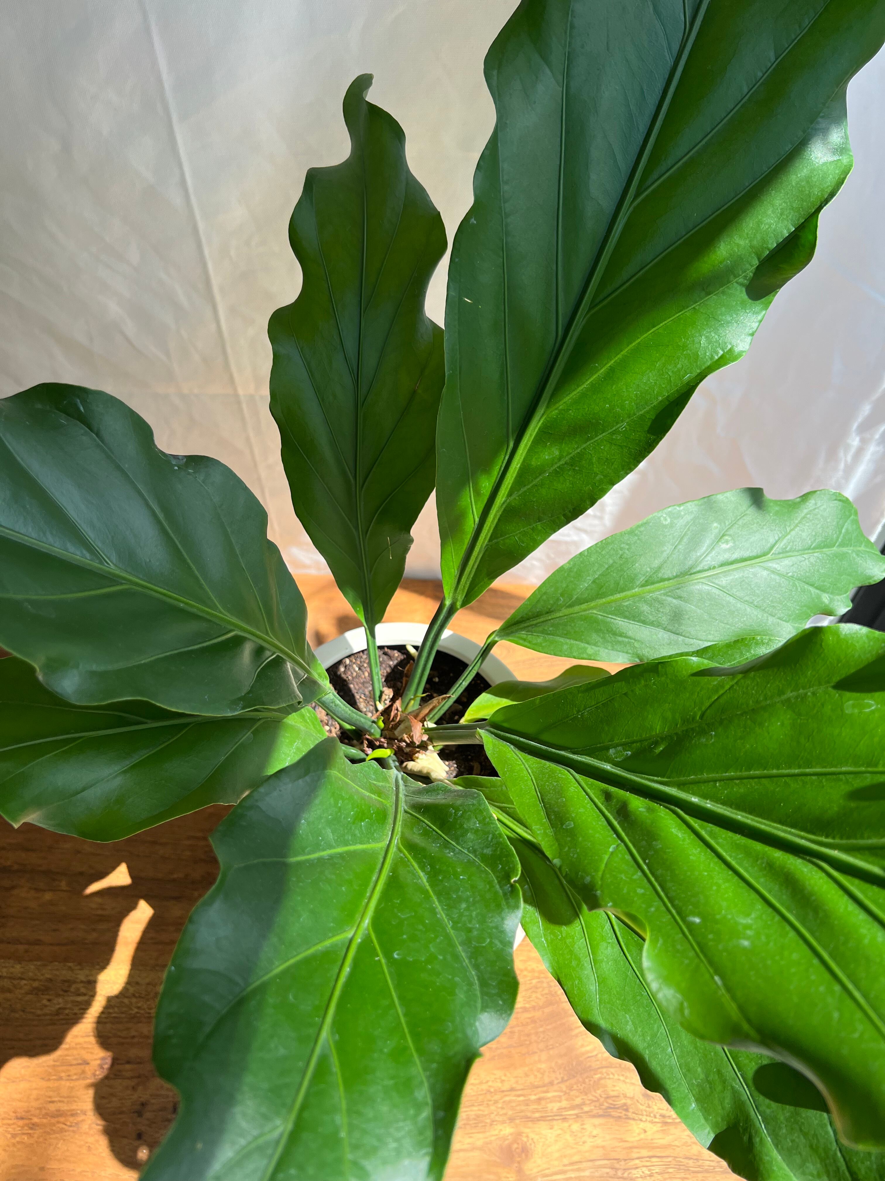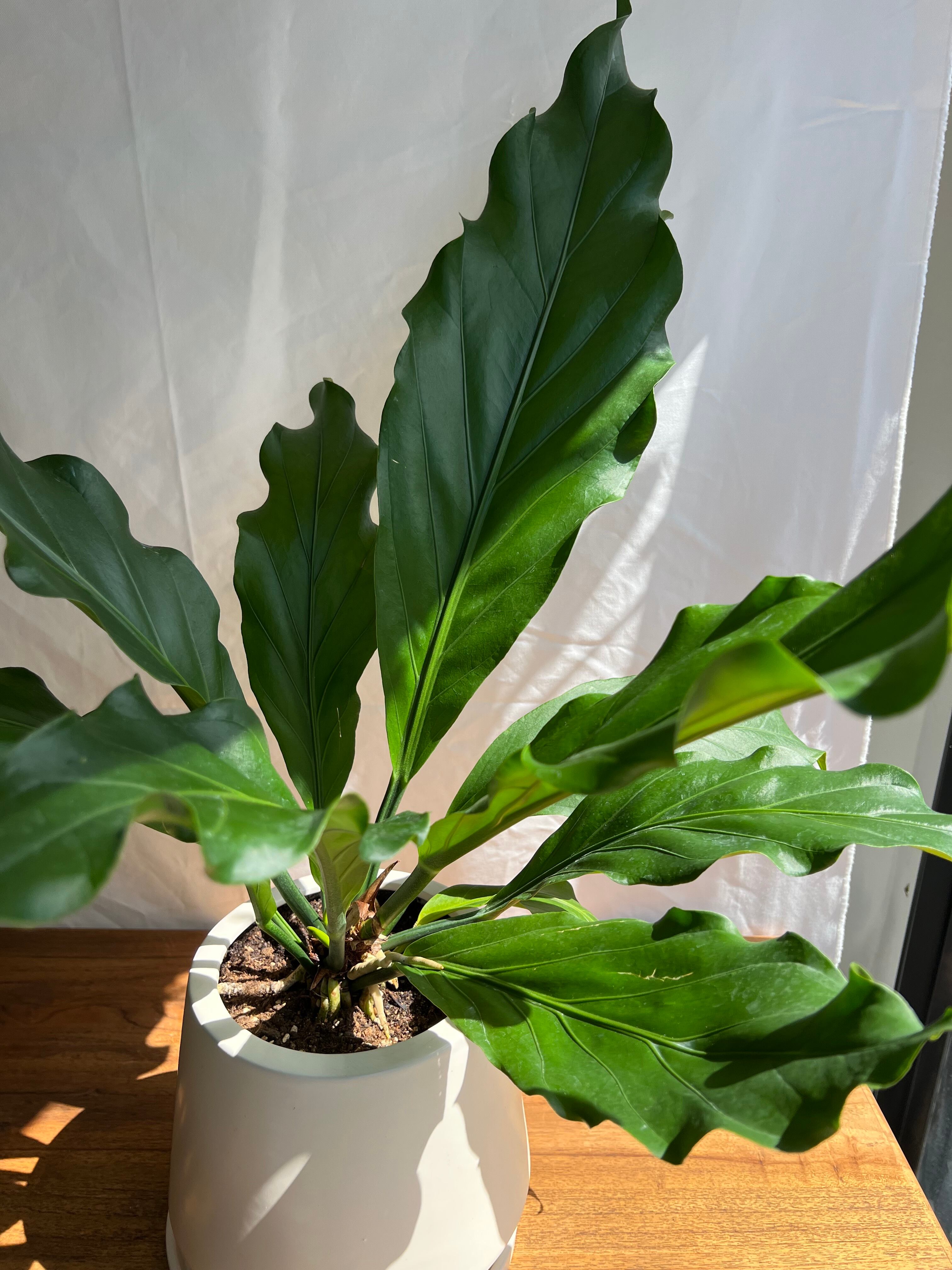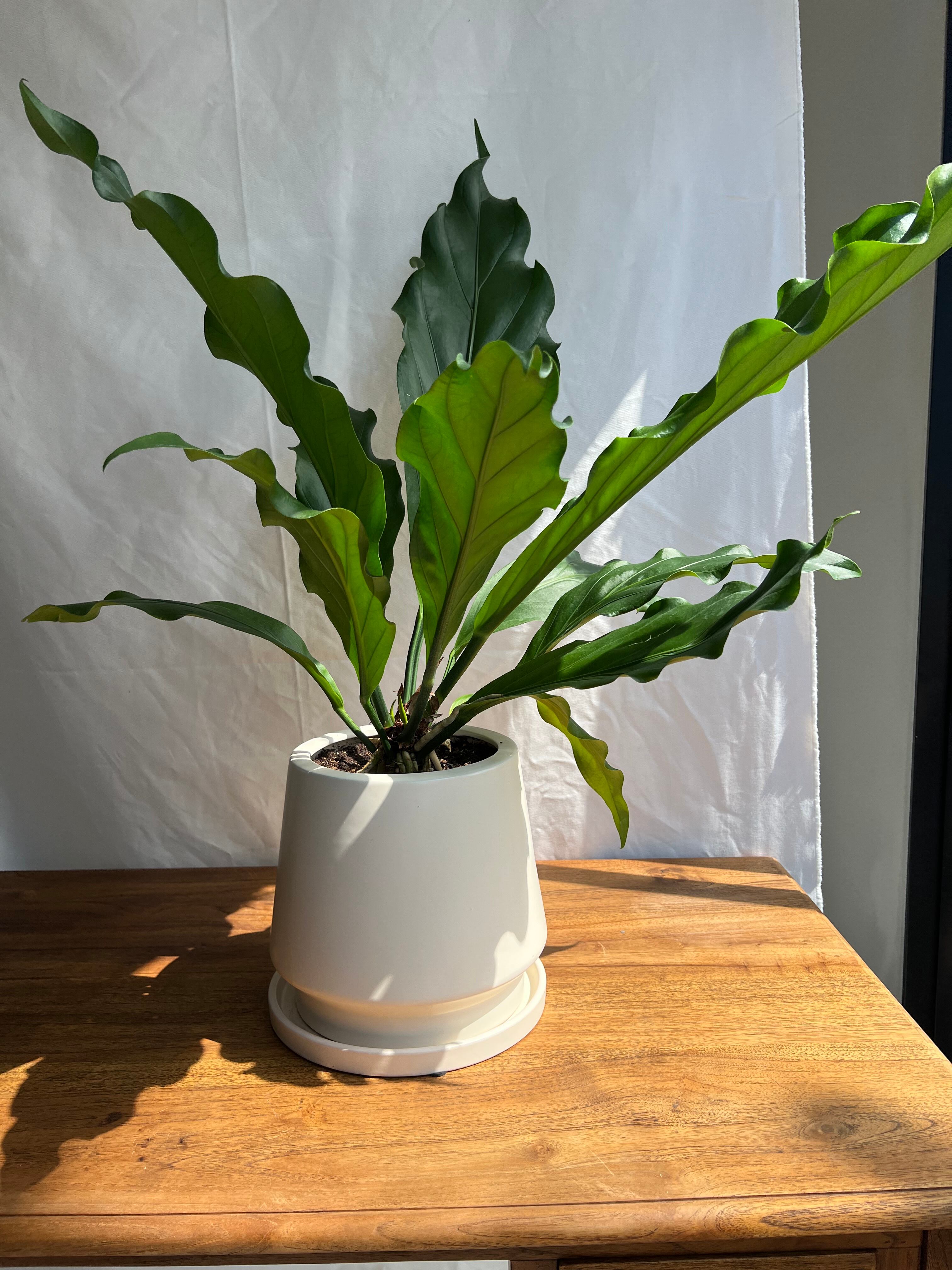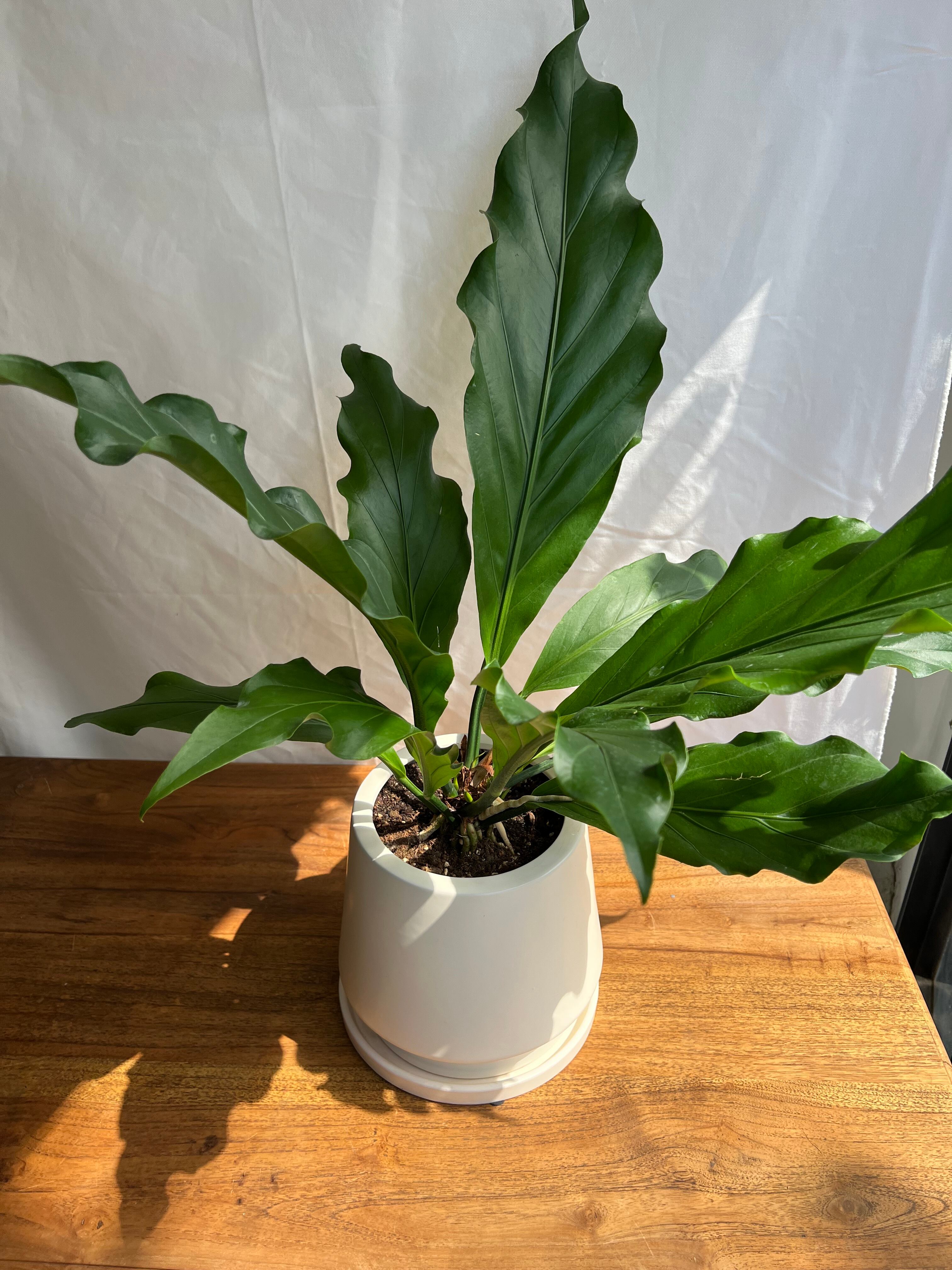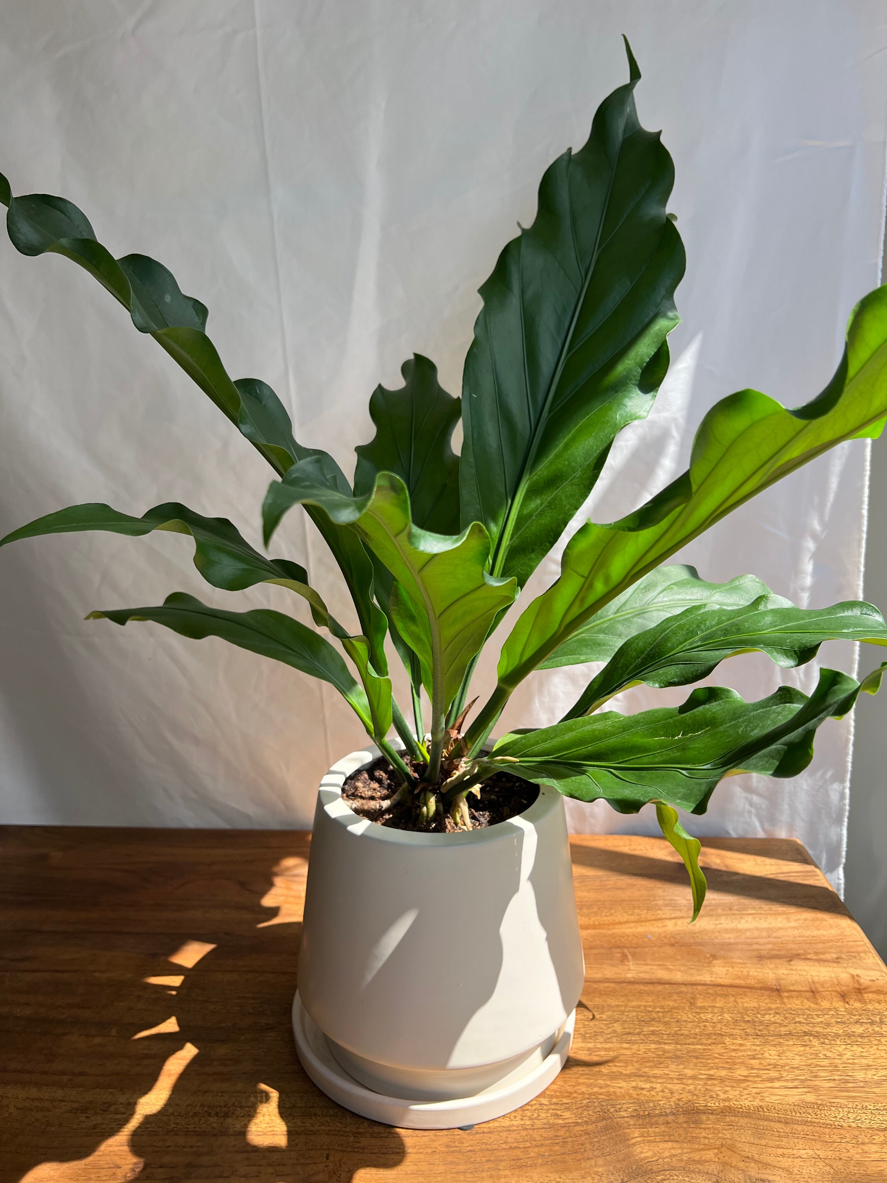 綺麗な葉の波が目立つように、お部屋の雰囲気などにも合わせやすいシンプルな白い鉢に合わせました。