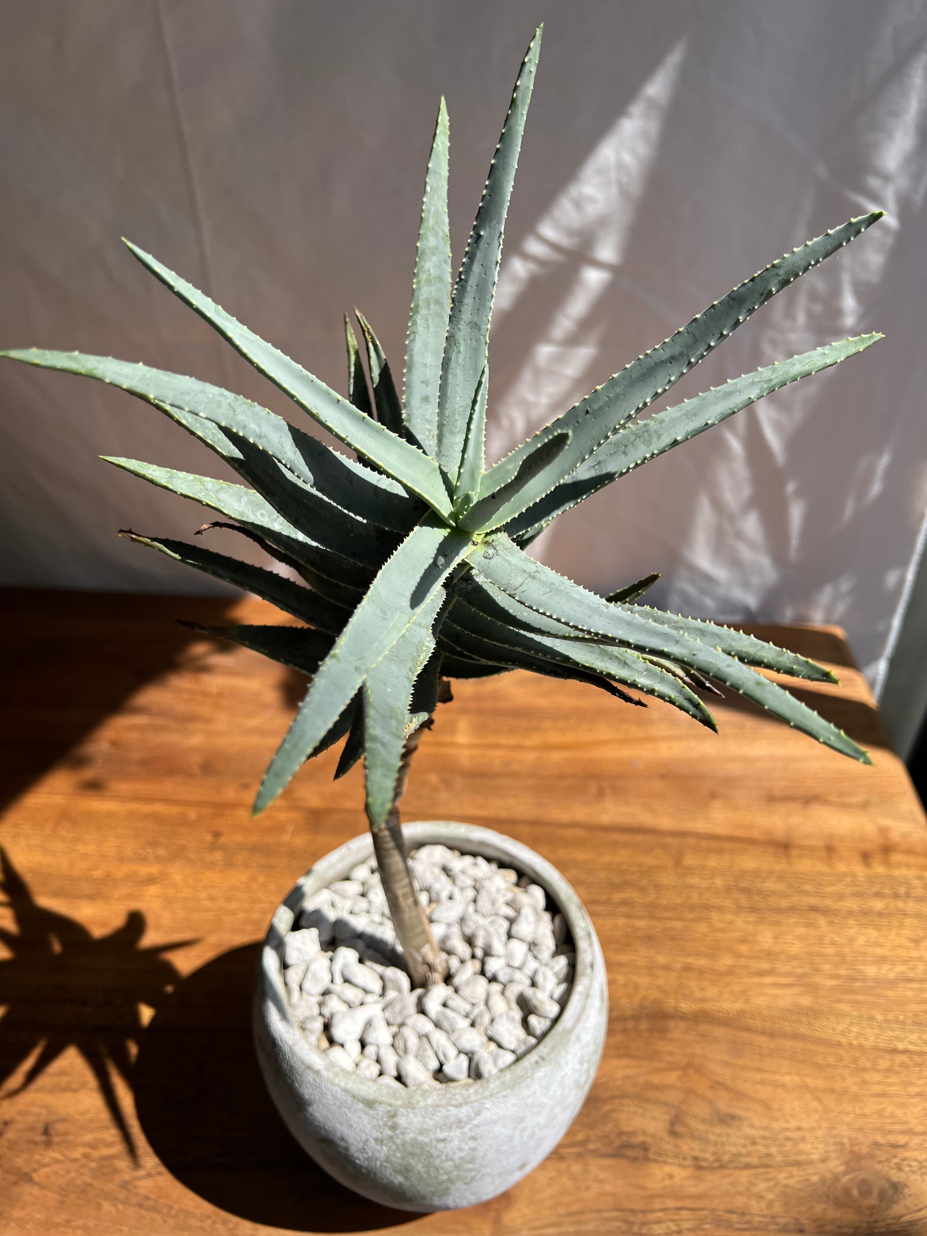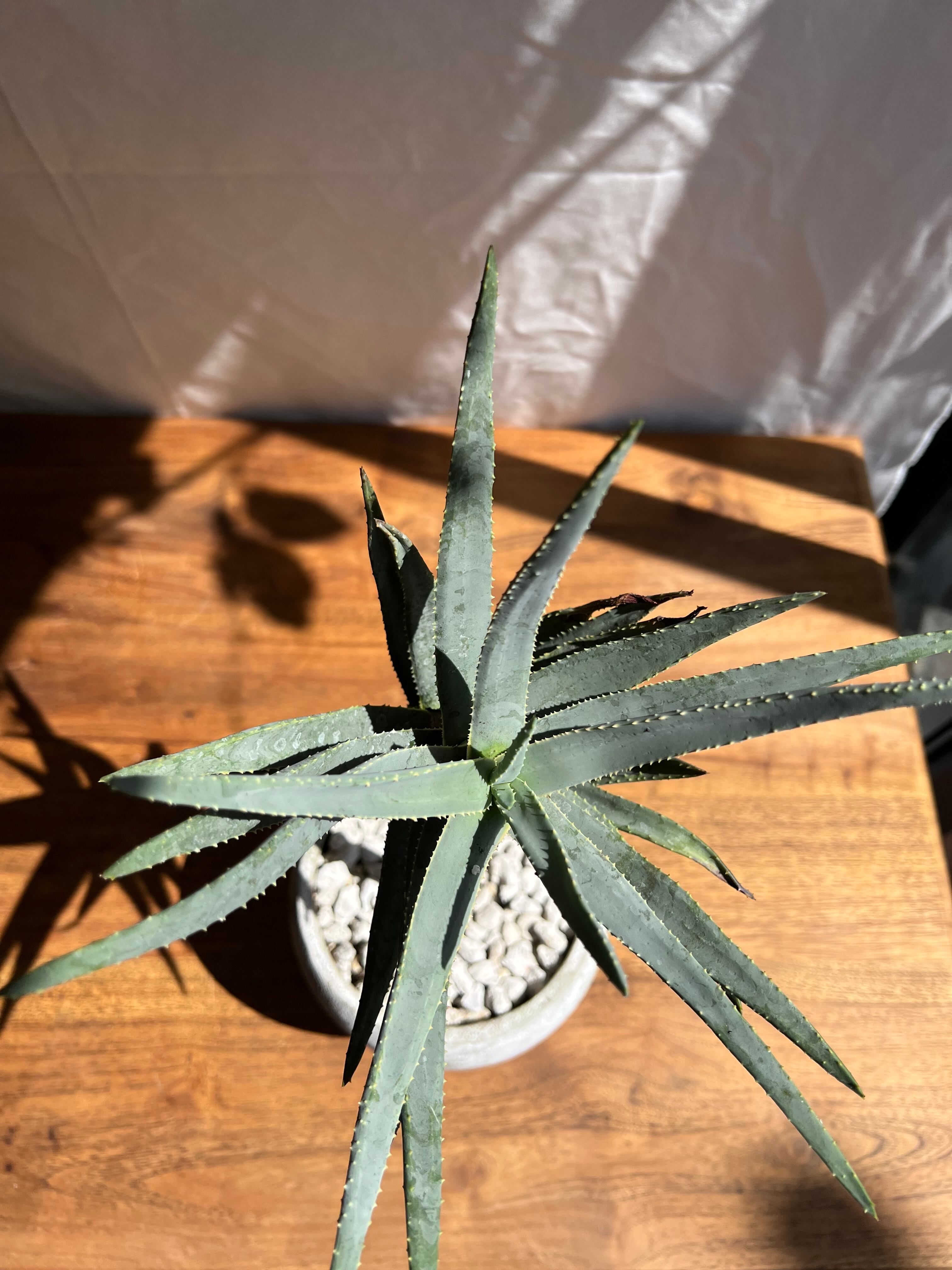 肉厚で水色のような青白い葉が上を向いて連なります。