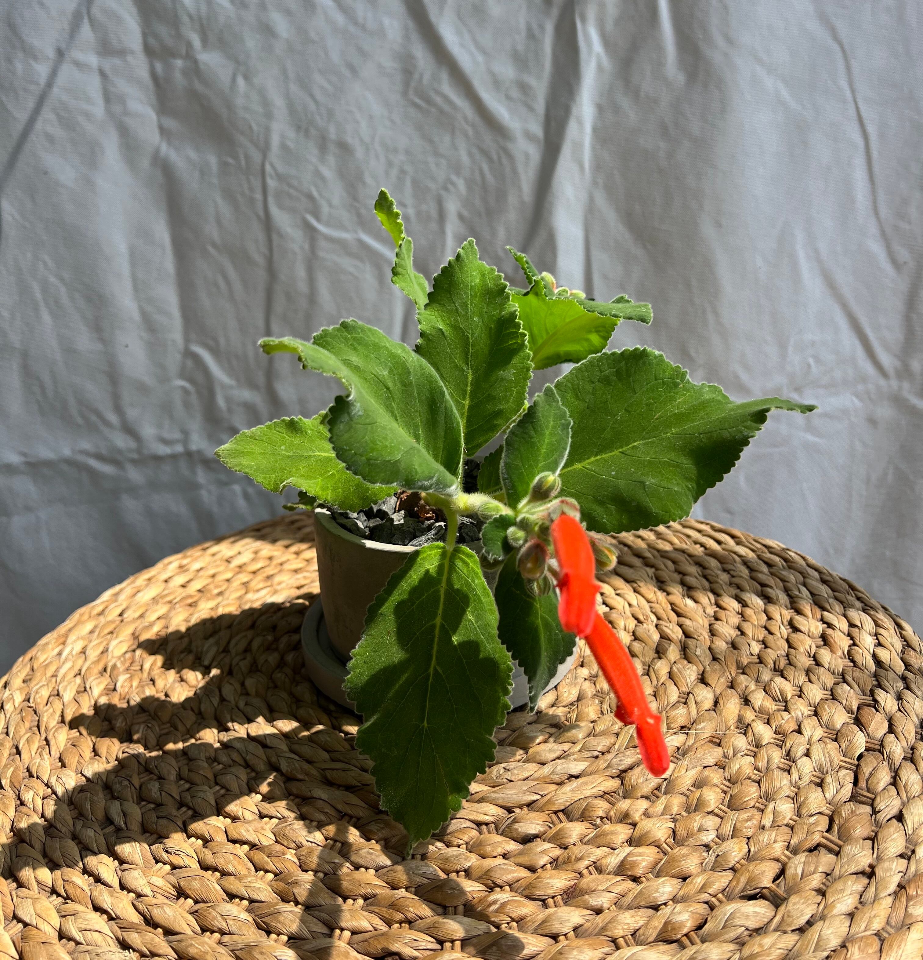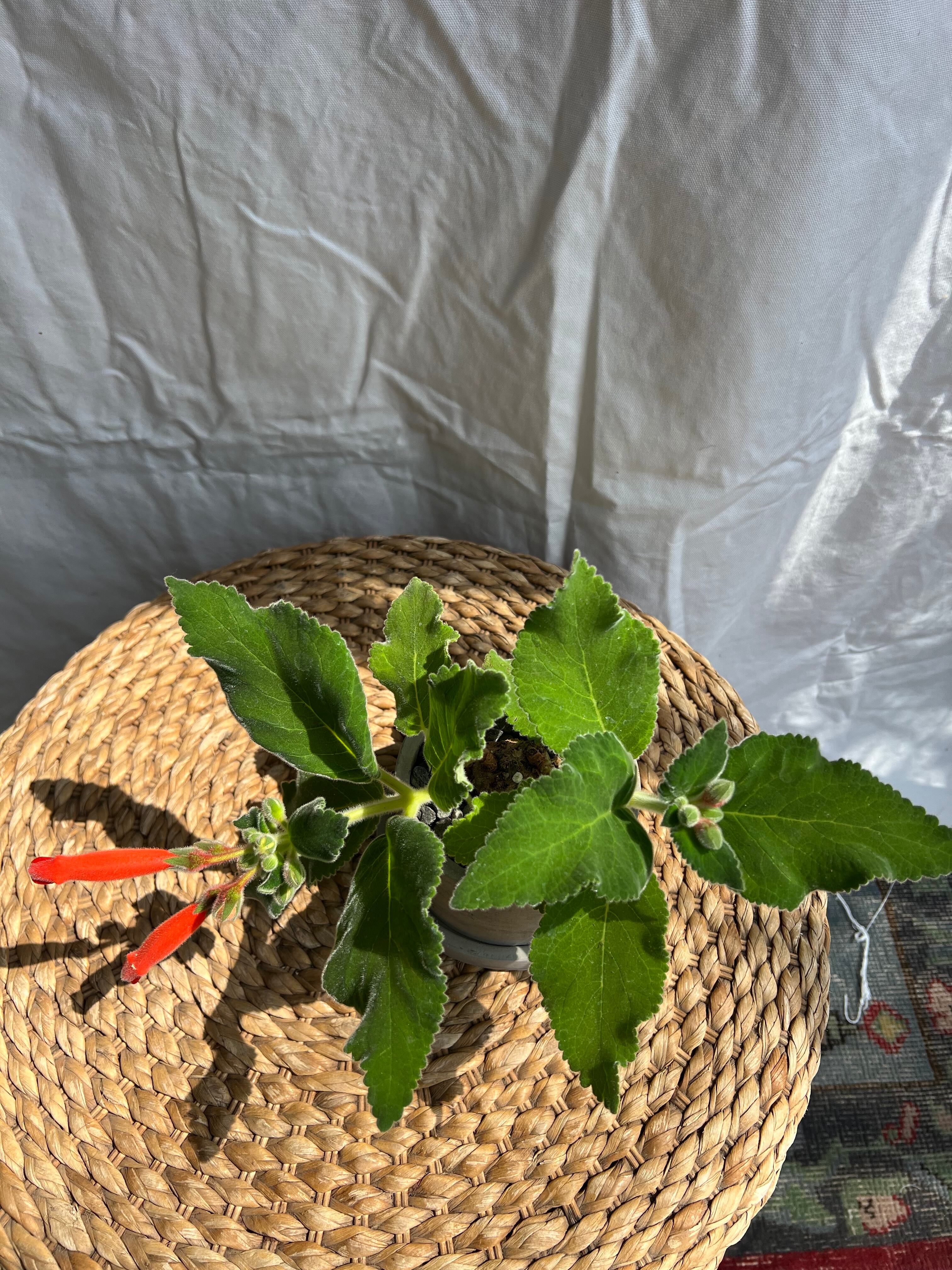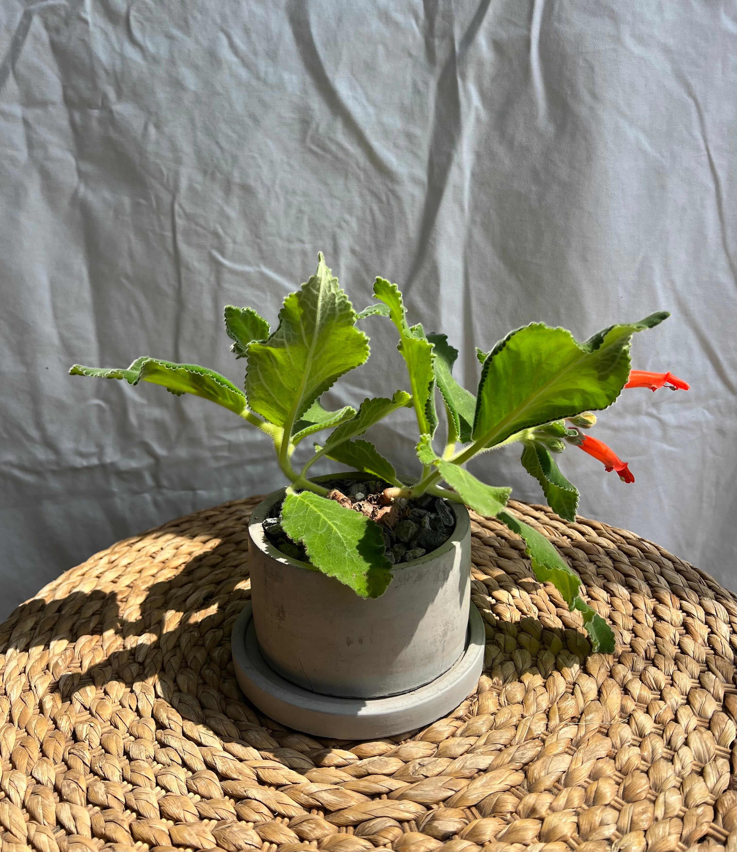 芋のような塊根部からシルバーの長い毛に覆われた葉を出し、成長期には真っ赤な花を咲かせる少し珍しい植物。