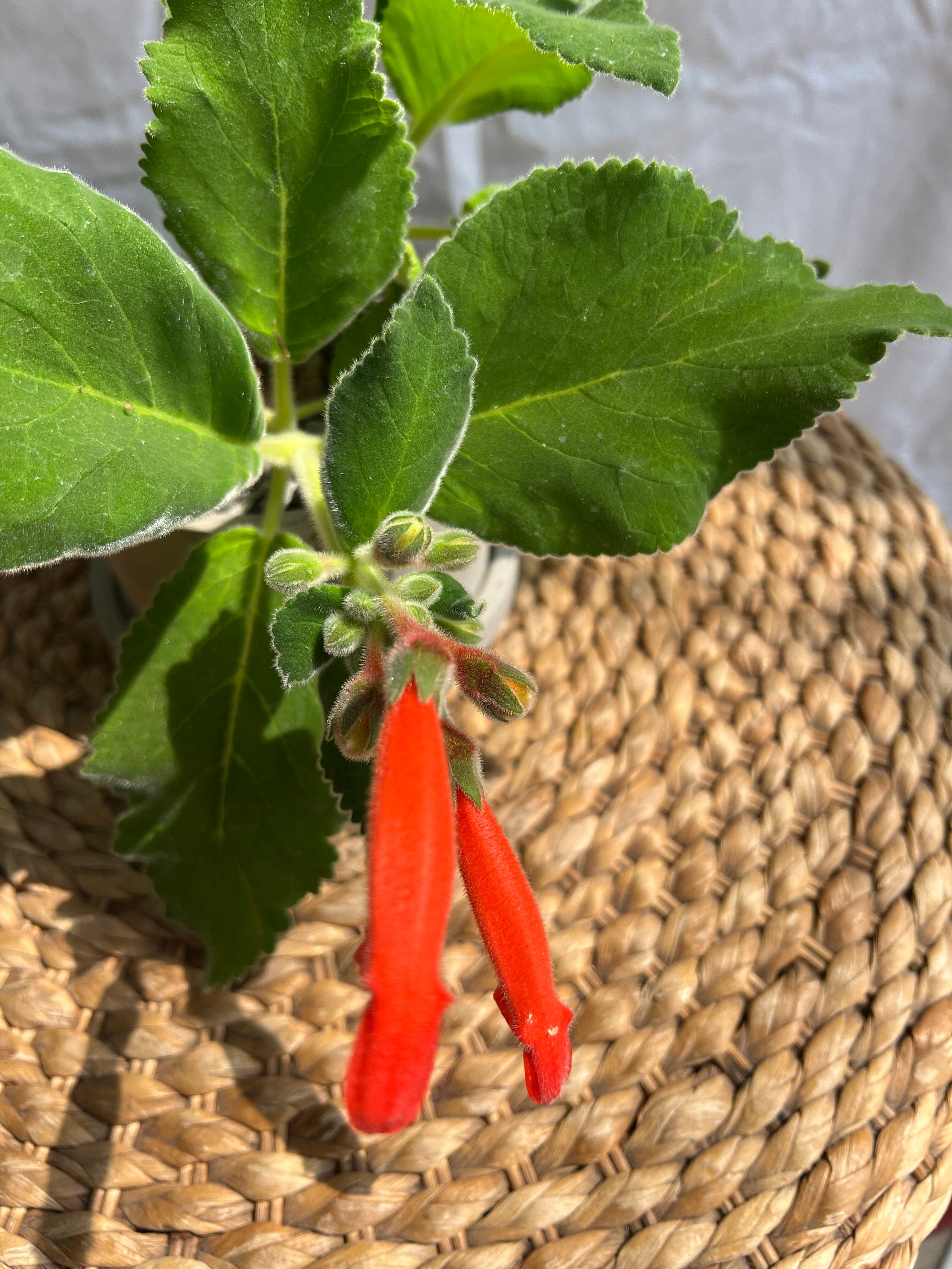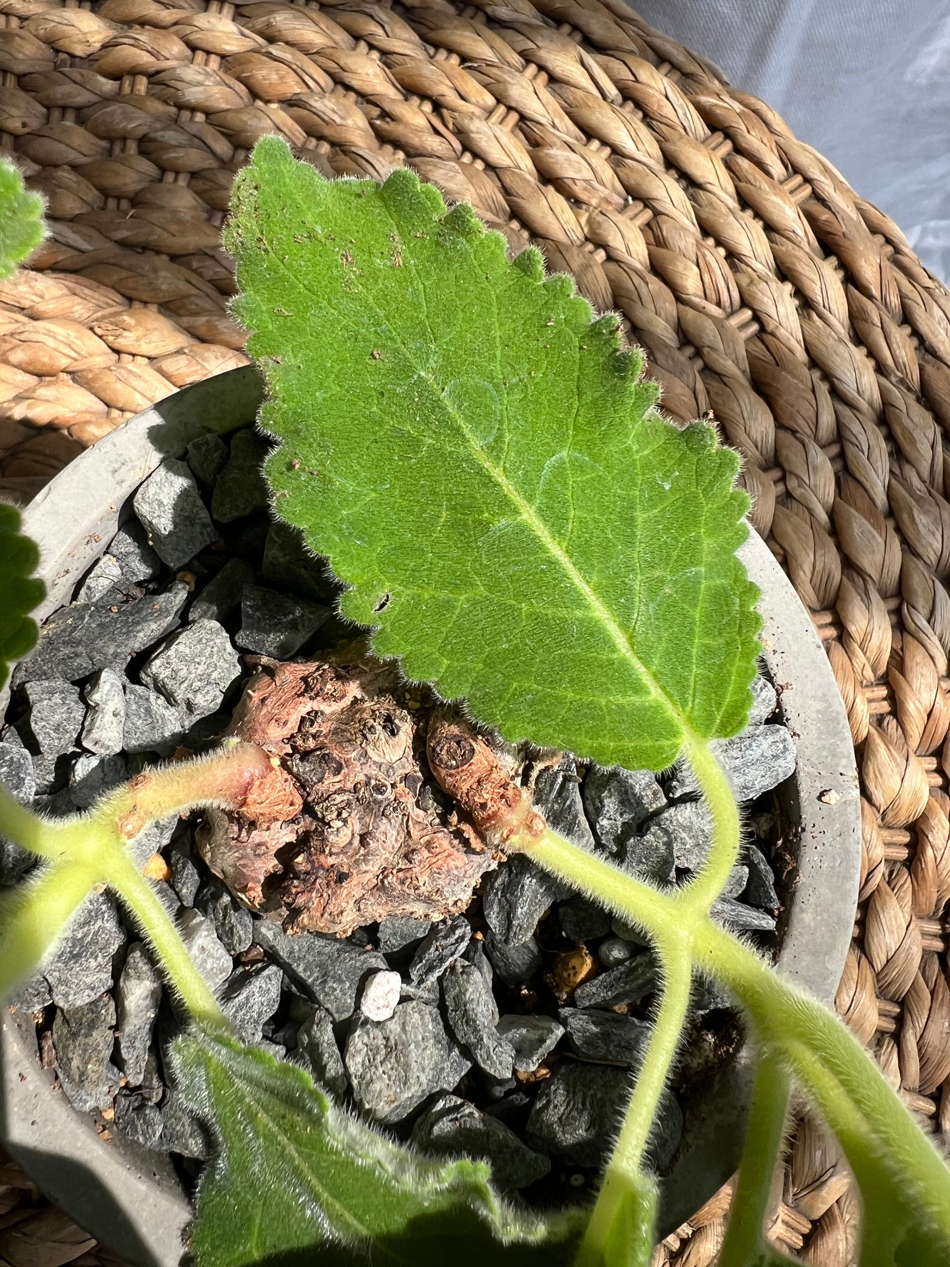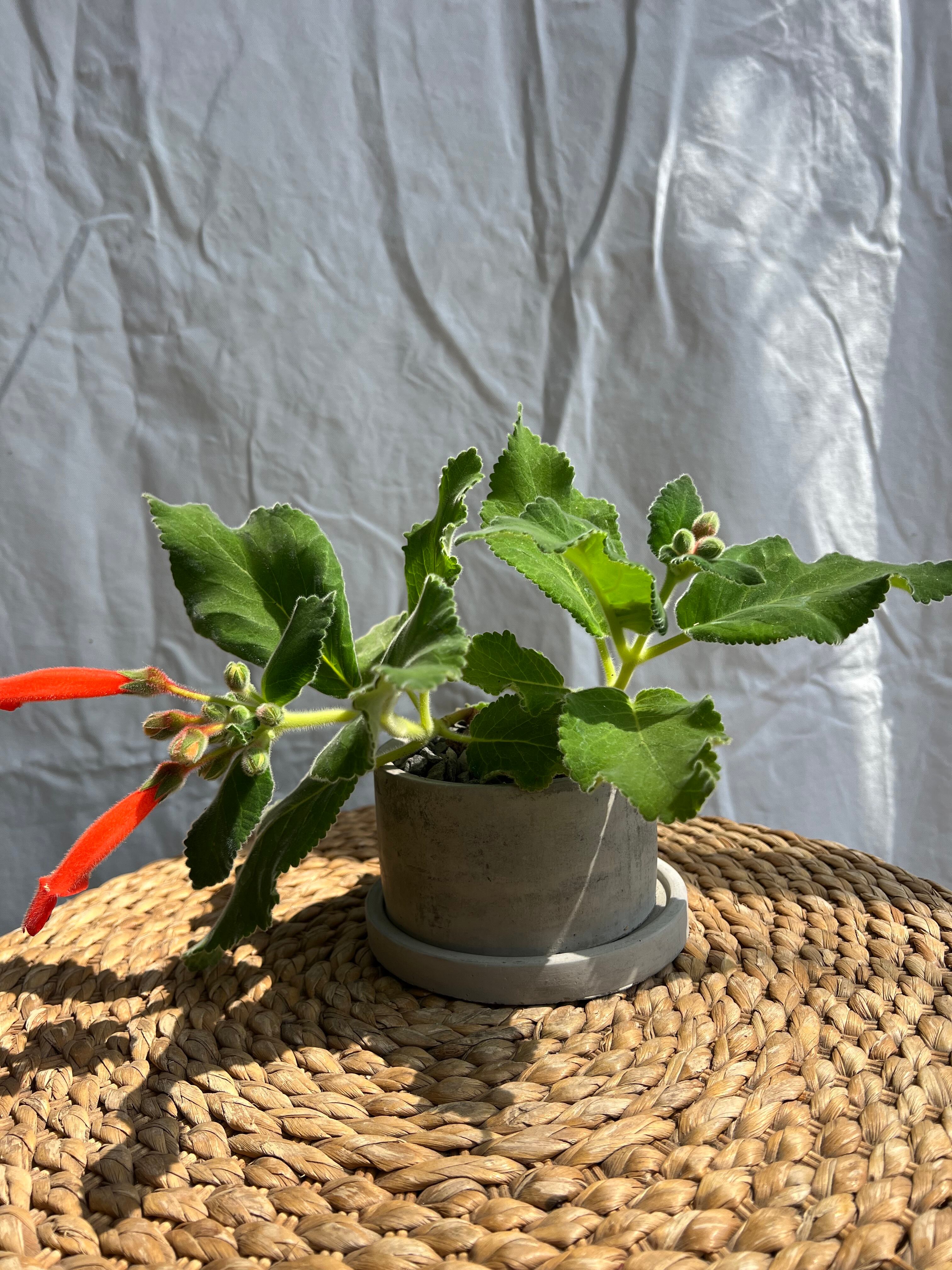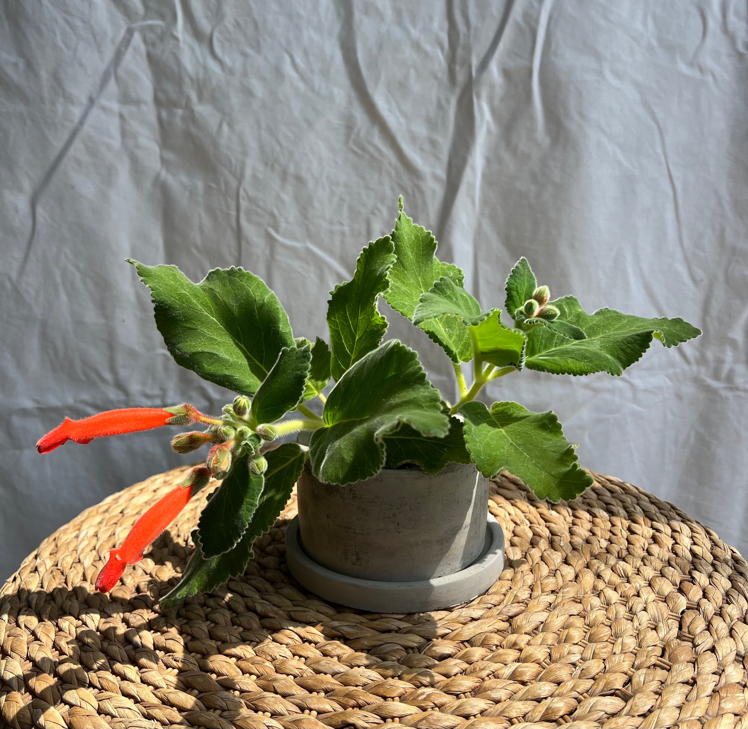 芋のような塊根部からシルバーの長い毛に覆われた葉を出し、成長期には真っ赤な花を咲かせる少し珍しい植物。